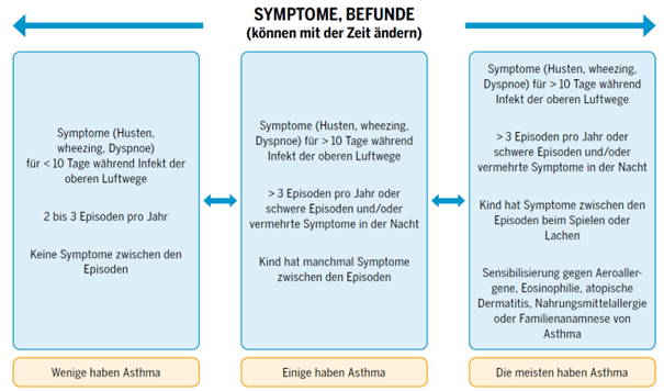 - Asthma Diagnose im Vorschulalter (1-4J) = frühkindliches Asthma: Anamnese und klinische Untersuchung genügen, wobei die Diagnose zurückhaltend gestellt werden soll, da sie Ängste hervorrufen kann. Besser beschreibt man es: «rezidivierende infektassoziierte obstruktive Bronchitiden», «Verdacht auf frühkindliches Asthma»).