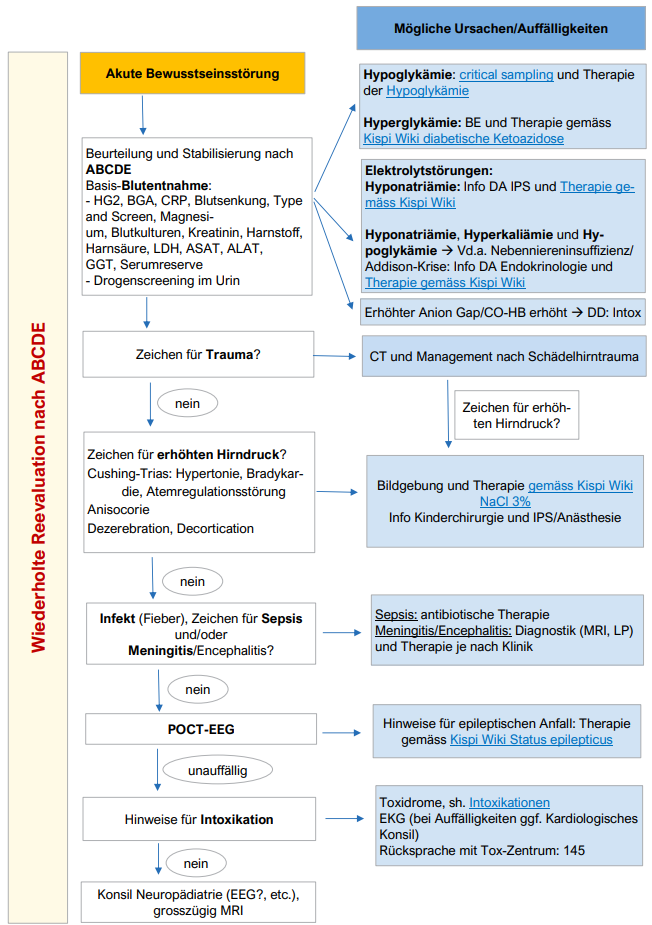 Bei Vd.a. Stoffwechselerkrankung/-entgleisung: Ammoniak (wenn nicht bei Basis-BE schon erfolgt), Aminosäuren im Plasma und Urin, organische Säuren im Urin, Acylcarnitine (Trockenblutkarte)