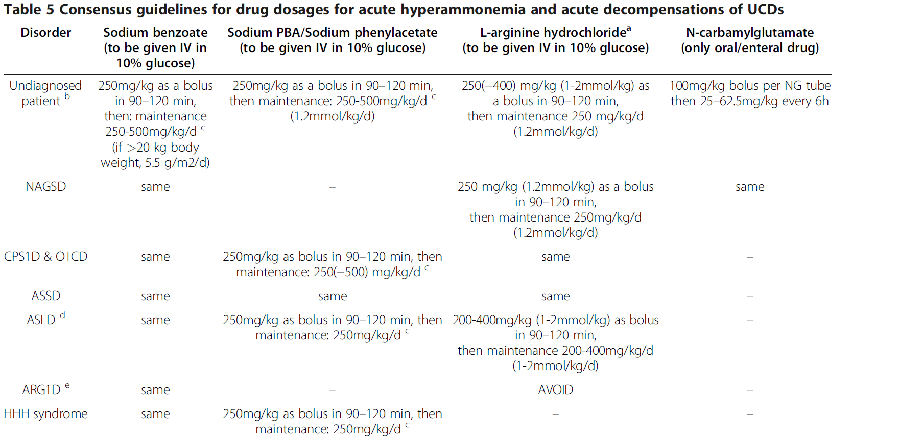 L-Arginin-Hydrochlorid in 10%iger Glukose 250 mg/kgKG als KI in 90-120 min, danach 250 mg/kgKG/d Erhaltungsdosis Na-Benzoat in 10%iger Glukose 250 mg/kgKG als KI in 90-120 min, danach 250-500 mg/kgKG/d Erhaltungsdosis Na-Phenylazetat in 10%iger Glukose 250 mg/kgKG als KI in 90-120 min, danach 250-500 mg/kgKG/d Erhaltungsdosis (Substanzen sollten auf IPS verfügbar sein) Kontaktaufnahme mit Dienstarzt Metabolik Kispi ZH (044 – 266 71 11) und Entscheid, ob N-Carbamylglutamat (Carbaglu®) aus ZH per Taxi beschafft werden sollte. Falls ja: Absprache über rechtzeitige Verlegung für evtl. Hämofiltration |