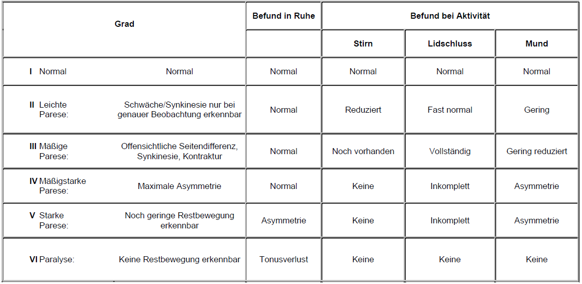 - Grading der Fazialisparese nach House-Brackmann (Tabelle 1)