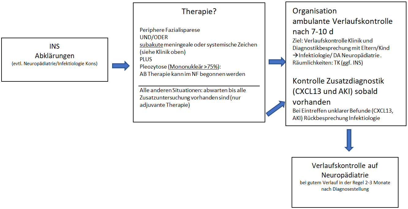 Nachkontrolle bei uns in jedem Fall (auch wenn keine Neuroborreliose) nach 7-10 Tagen via Zuweisung pädiatrische Infektiologie (ggf. zusätzlich Neuropädiatrie), falls kein Platz ausweichen auf Räumlichkeiten der Notfallstation für die Konsultation Infektiologie/Neuropädiatrie möglich.