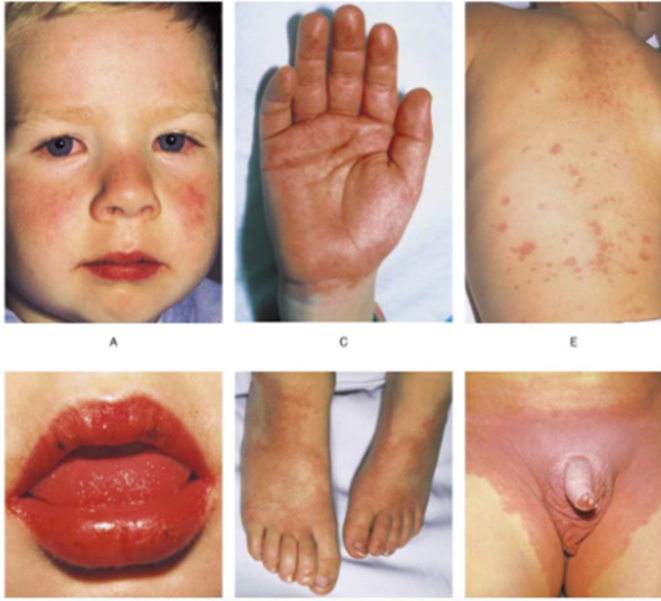 Erythem und Ödeme Hände und Füsse akute Phase und/oder periunguale Desquamation subakut |